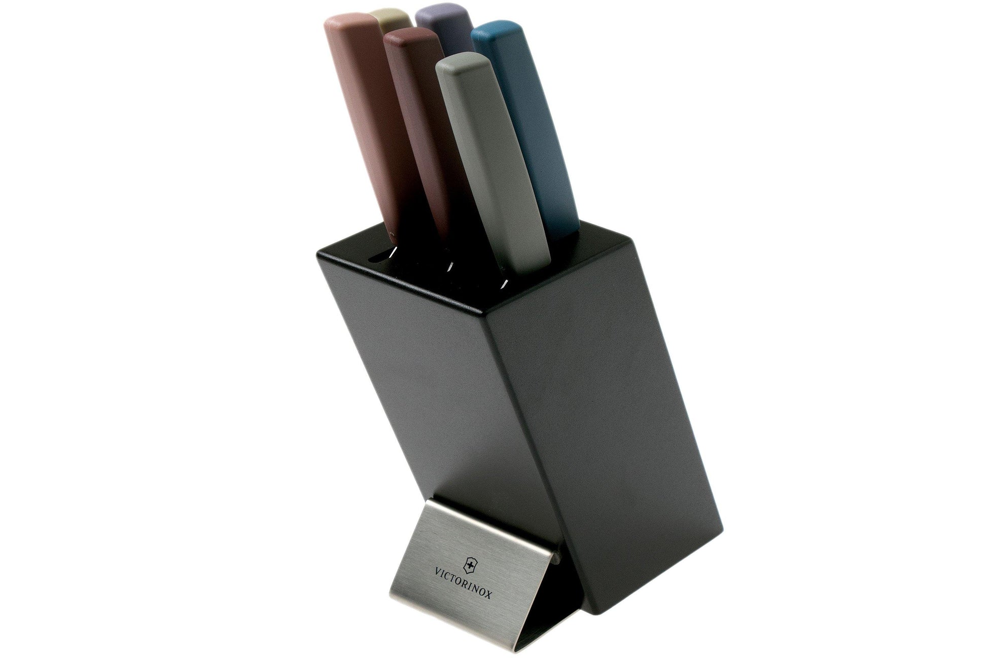Blloku i takëmeve të prodhimit zviceran, i punuar në dru të fortë ahu, që përmban pesë thika dhe një pirun të prodhimit zviceran