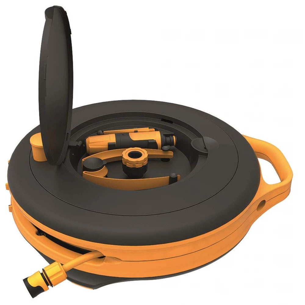 Set kompakt gjithëpërfshirës: Arritja totale deri në 15 metra, zorrë e qëndrueshme 9 mm 3/8", dizajn i lehtë Lehtë për tu shtrirë dhe për t'u mbështjellë në zorrë Lehtë për t'u përdorur për shkak të vendosjes horizontale të rrotullës, dollap me kyç për ruajtjen e aksesorëve. Të gjitha pjesët janë të pajtueshme me shumicën e produkteve të markave të tjera të ujitjes.